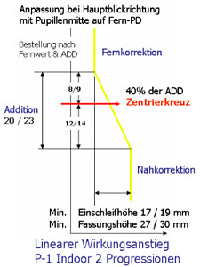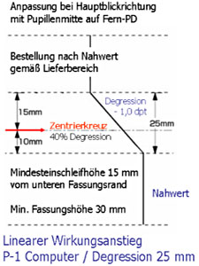 Die Konzeption der progressiven Nahgläser hat einen festgelegten Übergang von stets 1,0 dpt für eine erweiterte Nahbrille. Sie werden daher eher zu den Einstärkengläsern gezählt. Dadurch ist auch kein Inset, bzw. Nahversatz vorhanden. Die Gläser werden immer mit dem Nahwert geordert. Der progressive Wirkungsanstieg ist hier damit ein degressiver Wirkungsabfall. Es kommt somit auf den Bereich an, von dem aus die gleitende Wirkung betrachtet wird. Das P-1 Computer 1.56 weist als erweitertes Nahglas mit z.B. einer Wirkung von +3,0 dpt mit seiner Degression von -1,0 dpt im oberen Bereich die Wirkung von +2,0 dpt auf. Gleichermaßen weist das Glas einen Progressionsbereich mit 1,0 dpt auf, wobei der untere Nahbereich +3,0 dpt besitzt. Durch die konzeptionelle Lage des linearen Wirkungsanstiegs sind im gewohnten Durchblickspunkt, bzw. Zentrierkreuz 40% der Degression vorhanden. Selbstverständlich ist das SEIKO P-1 Computer 1.56 nur bei Additionen sinnvoll, die mehr als 1,0 dpt betragen. Eine Regel für progressive Nahgläser ist die Ermittlung der Akkommodation und des Gebrauchs in der Anamnese. In Abhängigkeit der Addition ist der Sehbereich mit den min./max. Sehdistanzen festgelegt.