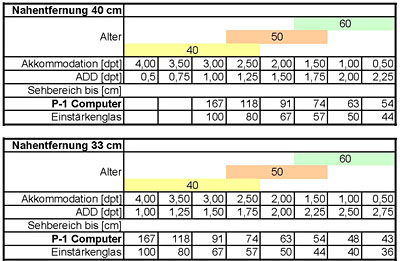 Sollte einmal bei einem P-1 Computer 1.56 die Korrektionsdaten der Addition von der fixierten Degression mit -1,0 dpt aufgehoben werden, kann auch ein Raumglas P-1 Indoor für die Bildschirmarbeit benutzt werden, d.h. alle speziellen Gläser für Nah- und Zwischenentfernungen können zur Erfüllung der Bildschirmarbeitsverordnung und einen Umgebungsbereich von 35-300 cm herangezogen werden.